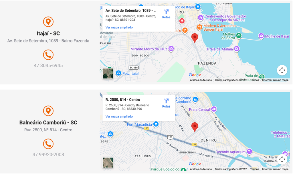 Possuímos unidades em Itajaí (Matriz), Balneário Camboriú, Tijucas, Nova Trento, São João Batista, São José e Palhoça.